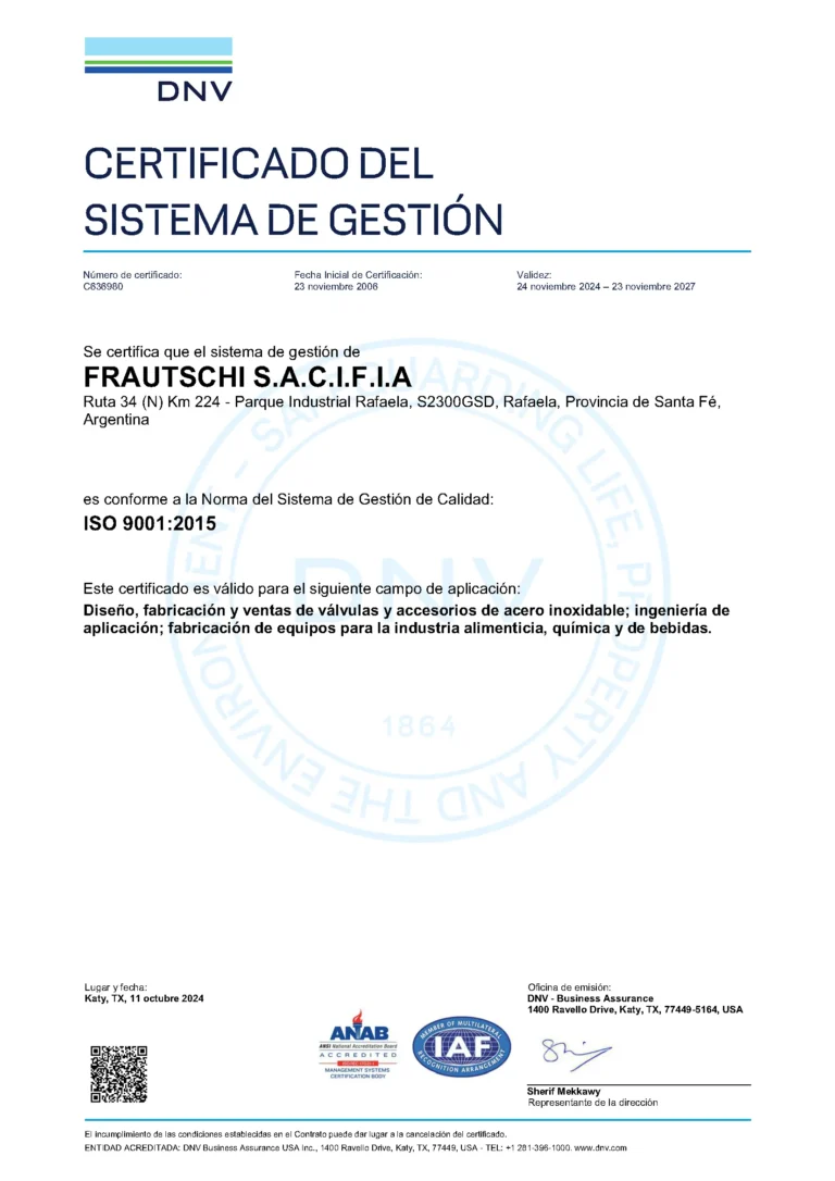 En noviembre de 2006, alcanzamos la certificación de gestión de calidad de la norma ISO9001:2000 para el diseño, fabricación y comercialización de válvulas y accesorios, otorgado por Det Norske Veritas. Esta herramienta nos permite asegurar nuestros procesos de manera tal de que nuestros clientes sean satisfechos en cuanto a sus requerimientos.